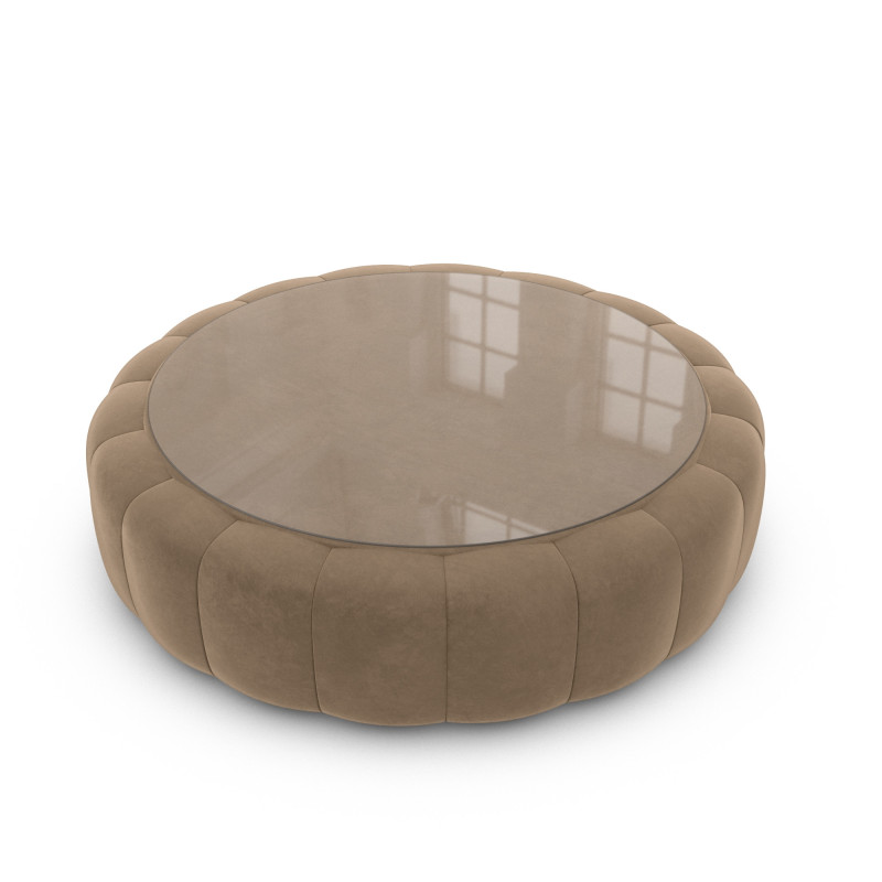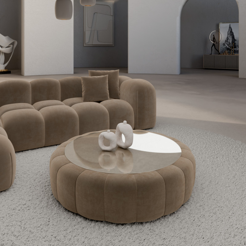 Dieser gepolsterte Couchtisch mit Glasablage vereint Luxus und Raffinesse in einem einzigen Möbelstück. Erlebe Qualität und innovatives Design in Einem.